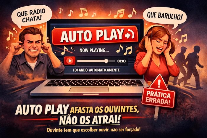 Entendam: o ouvinte nem sempre acessa o aplicativo ou o site da emissora para consumir o áudio. Quando isso acontece de forma automática, você acaba mais espantando do que atraindo. Deixe que o usuário decida se ele quer ouvir a programação naquele momento ou não. E, acredite, quando o comando está com ele, o valor do PLAY é muito mais gratificante, afinal ele realmente quer te ouvir.