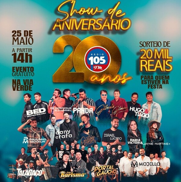 Entre os destaques da comemoração está o sorteio de R$ 20 mil, exclusivo para os ouvintes que participarem do evento. A programação musical inclui nomes como Bruninho e Davi, Zé Henrique e Gabriel, Cantor Panda, Gilberto e Gilmar, Hugo e Tiago, Paulinho Mocelin, Dany e Rafa, Gustavo Bardim, Israel Lucero, Maria Victória, Jayne Martins, Talagaço, Grupo Karisma, Portal Gaúcho e Banda Modello.