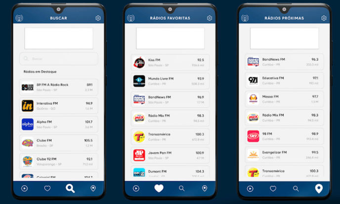 Telas “Busca/Destaques”, “Favoritos” e "Rádios Locais" do APP Tudo Rádio