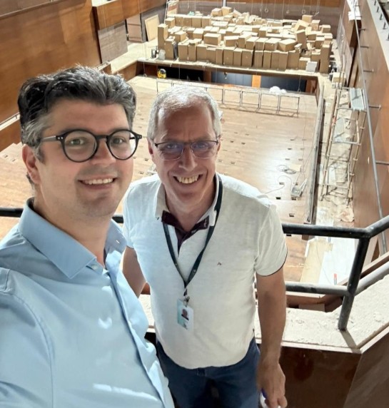 Pedro Campos e Edilson Ventureli, maestro e CEO do instituto, durante a construção do novo Teatro Baccarelli. Crédito: Pedro Campos/Arquivo pessoal
