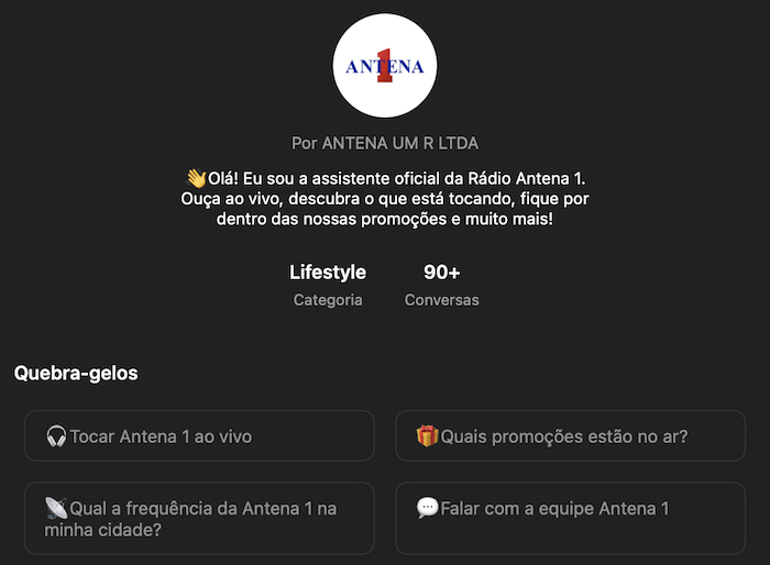 Ao buscar por “Antena 1” na aba GPTs do ChatGPT, os usuários passam a ter acesso a um assistente virtual exclusivo da emissora, criado especialmente para oferecer uma nova forma de contato com o público. O recurso permite que o ouvinte descubra qual música está tocando no momento, acesse informações sobre artistas, campanhas promocionais e notícias musicais, além de interagir com conteúdos especiais da programação.