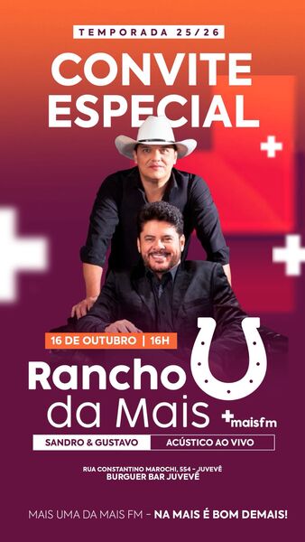 Com mais de duas décadas de estrada, Sandro e Gustavo se consolidaram como uma das duplas de maior reconhecimento no Sul do país, acumulando sucessos nas rádios e nos palcos. O Rancho da Mais tem o patrocínio da Fito Mais Saúde, empresa parceira da emissora.