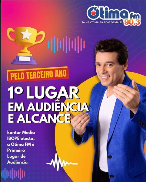 A Ótima FM 90.3 de São José dos Campos (SP) iniciou uma campanha institucional que destaca sua liderança em audiência e alcance, conforme dados do mais recente levantamento da Kantar IBOPE Media (06h-19h/segunda à sexta-feira, 7 a 15 de setembro de 2025). Paralelamente, o grupo anuncia o início da programação local da Ótima FM 89.1 de Ribeirão Preto (SP), previsto para novembro, ampliando a atuação da marca no interior do estado.