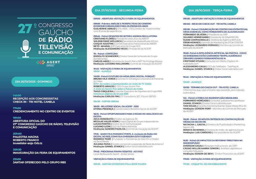 Na segunda-feira (27), as atividades começam às 9h com a palestra “Análise e perspectivas do cenário econômico brasileiro para os próximos anos”, conduzida por Guilherme Abbud (Persevera Asset Management). Logo depois, às 9h45, ocorre o painel “Desafios do setor e agenda regulatória”, com Cristiano Flores (presidente-executivo da ABERT), Wilson Diniz Wellisch (Secretário de Radiodifusão do MCom), Caíque Agustini (Comitê Executivo Institucional da ABERT), Beto Amaral (VP Executivo do Grupo SCC) e mediação de Alessandro Heck, presidente da Agert.