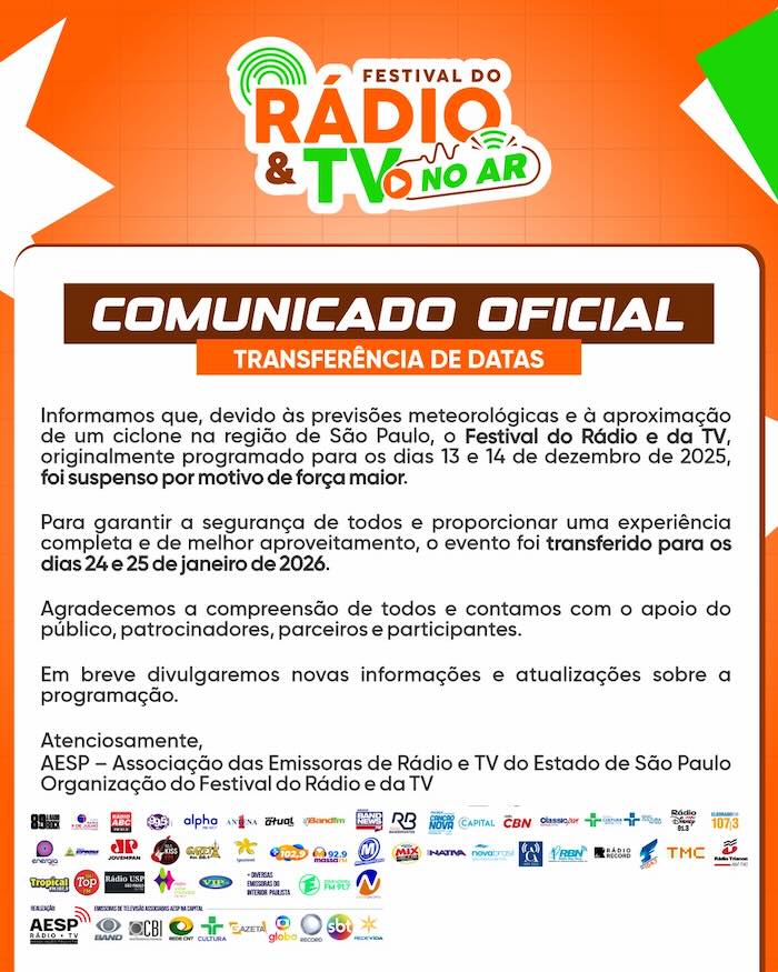 Foi remarcado para janeiro o Festival do Rádio e da Televisão Paulista. A AESP (Associação das Emissoras de Rádio e Televisão do Estado de São Paulo) confirmou ontem (9) a nova data do evento, que iria ser realizado no próximo final de semana. O motivo é a previsão de tempo instável em São Paulo, devido aos efeitos do Ciclone Extratropical que atinge as regiões Sudeste e Sul do país. A programação com a reunião histórica das emissoras de rádio e TV seguirá no formato previsto, mas nos dias 24 e 25 de janeiro, coincidindo com o aniversário da capital paulista. E essa união de rádios e grupos concorrentes, chamada de Festival do Rádio e da Televisão Paulista, ocorrerá em um momento especial para o meio, que viu um crescimento no número de ouvintes únicos concentrado nas emissoras nas pesquisas mais recentes da Kantar IBOPE Media, sendo também alusivo aos 90 anos da AESP.