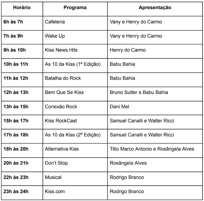 A nova grade diária da emissora teve início às 6h, com a dupla Vany e Henry do Carmo à frente dos programas Cafeteria e Wake Up. O período da manhã conta também com o informativo Kiss News Hits e com o programa As 10 da Kiss, apresentado por Babu Bahia, que reforça a interação com o público.