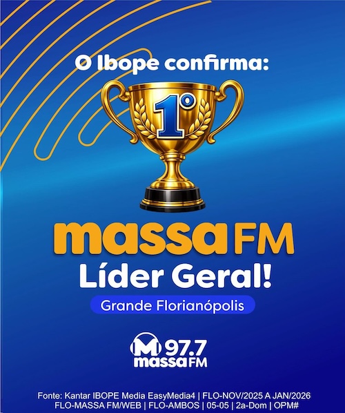 A Massa FM 97.7 está realizando uma campanha institucional sobre sua liderança de audiência na Grande Florianópolis. O feito considera as emissoras que atualmente são assinantes da medição realizada pela então Kantar IBOPE Media e foi alcançado nos principais períodos da pesquisa no trimestre de novembro de 2025 a janeiro de 2026. O período-base utilizado pela Massa FM nas campanhas foi 05h-05h/FM+WEB/todos os períodos, e esse novo quadro ocorre após a emissora apresentar um movimento de crescimento constante nas últimas rodadas da medição.