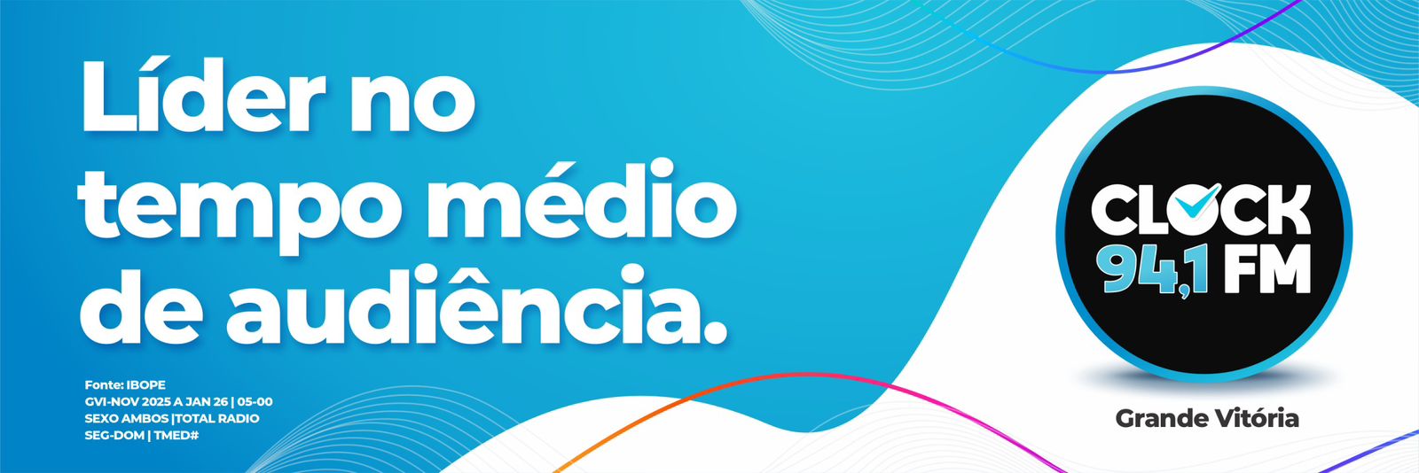 A Clock FM 94.1 de Vitória, emissora de formato adulto-contemporâneo na Grande Vitória, está destacando em sua comunicação recente os resultados obtidos na mais recente pesquisa da Kantar IBOPE Media, referente ao trimestre novembro de 2025 a janeiro de 2026. O levantamento aponta a rádio como líder em tempo médio de audiência geral no rádio da região e também como destaque em afinidade com o público acima dos 40 anos, indicadores que passaram a integrar a atual campanha institucional da emissora.