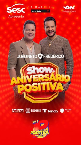 A Positiva FM 99.1 de Goiânia comemora seus 21 anos de atuação com uma ação especial voltada ao público. A emissora promove nesta quinta-feira (19) um show gratuito com a dupla João Neto & Frederico, na praça de alimentação do Passeio das Águas Shopping, na capital goiana. O evento está previsto para começar a partir das 19h e contará também com caráter solidário.