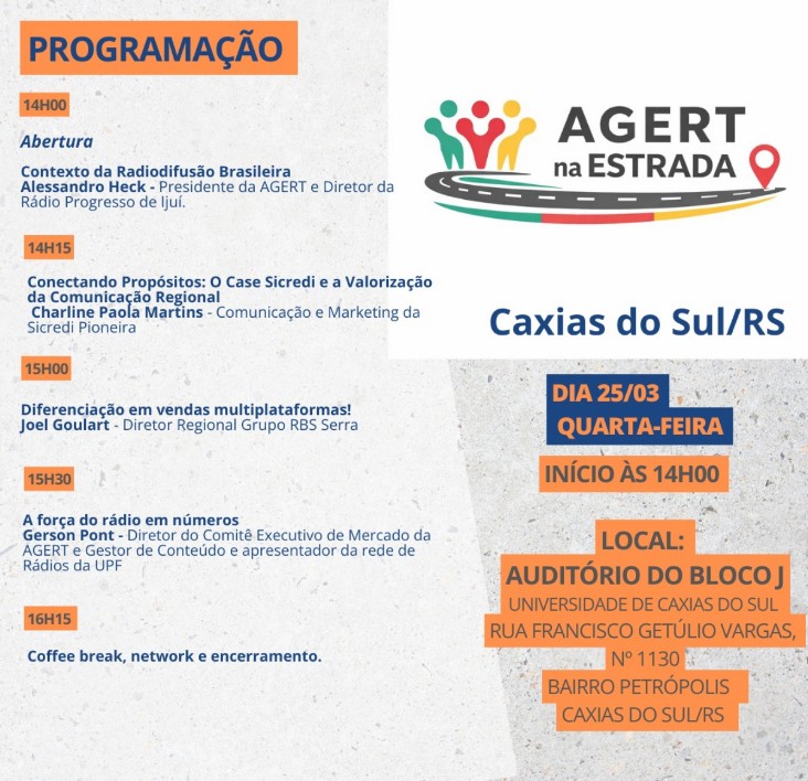 A cidade de Caxias do Sul (RS) receberá na próxima quarta-feira (25) mais uma edição do projeto AGERT na Estrada, iniciativa que reúne profissionais do setor para discutir o cenário da radiodifusão brasileira, estratégias comerciais e a relevância do meio rádio no ambiente multiplataforma. O encontro será realizado a partir das 14h00, no auditório do Bloco J da Universidade de Caxias do Sul.