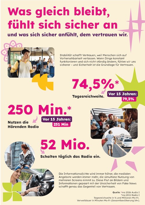 Os dados apontam que 74,5% da população alemã com mais de 14 anos consome diariamente rádio ou áudio digital das emissoras de segunda a sexta-feira, considerando diferentes formas de recepção, como rádio tradicional, web rádios e plataformas digitais, incluindo o DAB+ (rádio digital terrestre). No total, cerca de 52 milhões de pessoas escutam rádio todos os dias, reforçando o papel do meio como companheiro constante na rotina.
